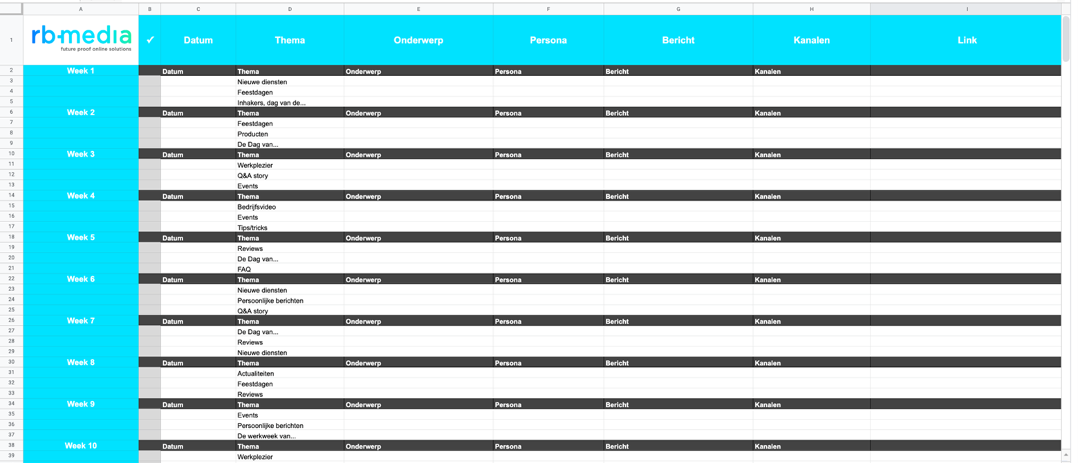 Alle ideeën voor content die je in de aankomende periode wilt plaatsen, verwerk je in een contentkalender. Hierin geef je aan voor wie de content bedoeld is, wat het onderwerp is van de content, wanneer je de post wilt plaatsen en welk kanaal je daarvoor wilt inzetten. Vervolgens vink je af wat je hebt geplaatst. Zo creëer je structuur en overzicht voor jezelf en voor je collega’s. Net als veel andere bedrijven werken ook wij met een contentkalender. Bekijk hier onze opzet van een contentkalender. Wil je zelf aan de slag gaan met een contentkalender? Richt hem dan zo in dat hij voor jou (en je collega’s) prettig werkt.