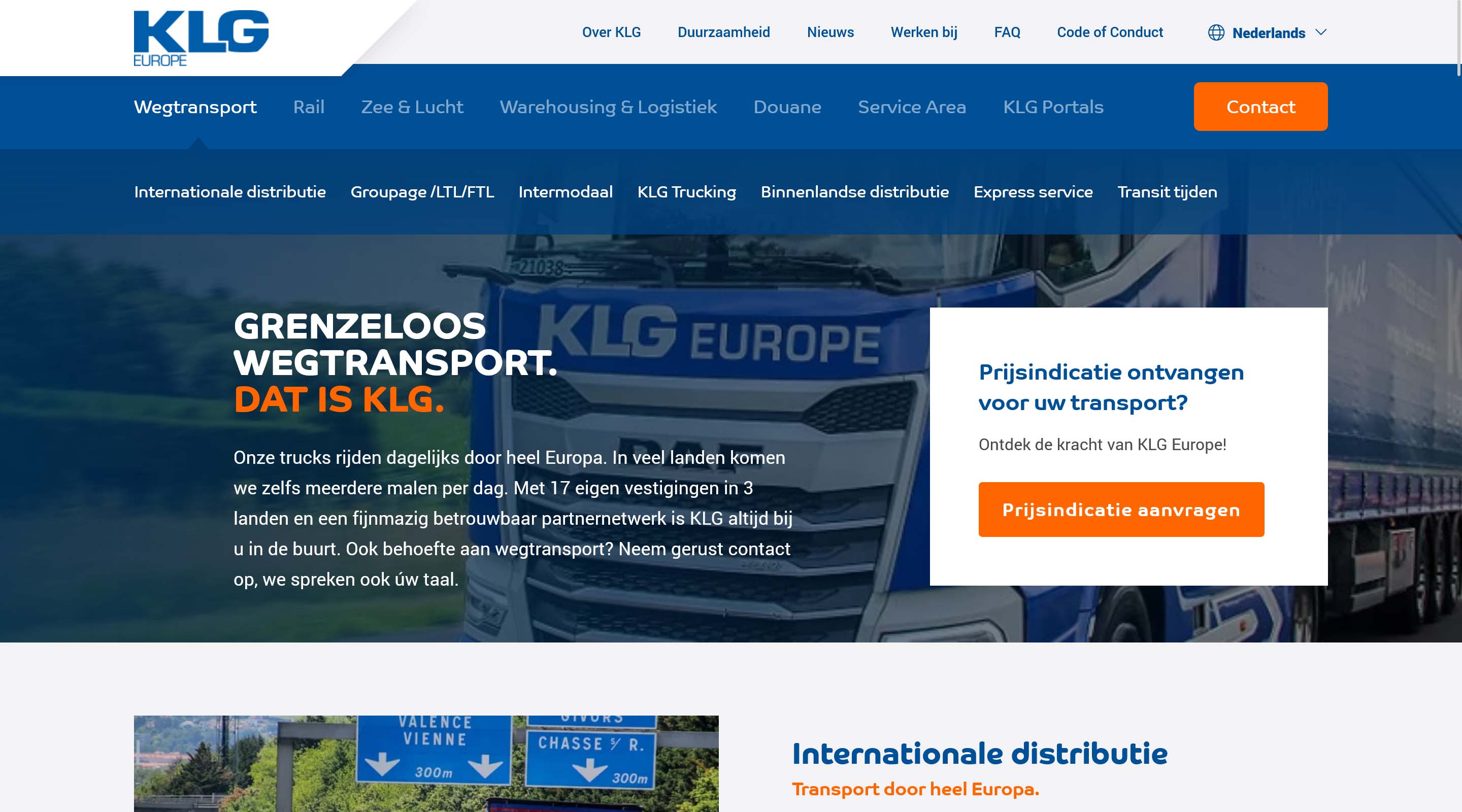 Logistieke dienstverlening in een digitaal jasje. Waar de route ook online een logische is. Met trots ontwikkelden we voor KLG Europe een maatwerk website en houden we deze al jarenlang up-to-date, steeds voorzien van een modern jasje. Bekijk hier de website van KLG Europe.