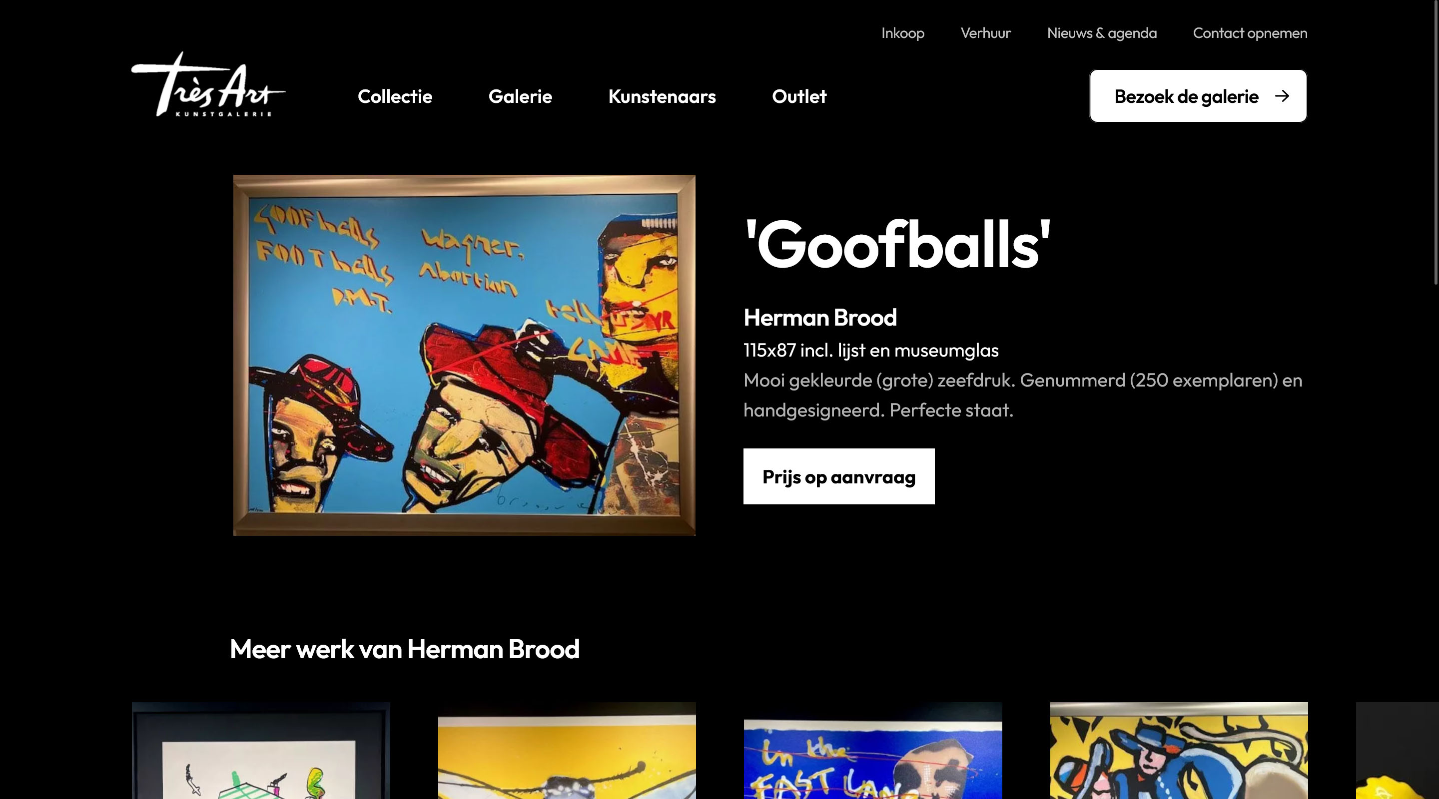 Kunstgalerie Très Art, een bekende naam in Breda met een ruime collectie kunstwerken van grootheden als Andy Warhol, Herman Brood, Pablo Picasso, Loes van Delft en Anton Corbijn. De nieuwe website van Très Art is eigentijds, overzichtelijk en een mooie online presentatie van een groot deel van de unieke collectie.