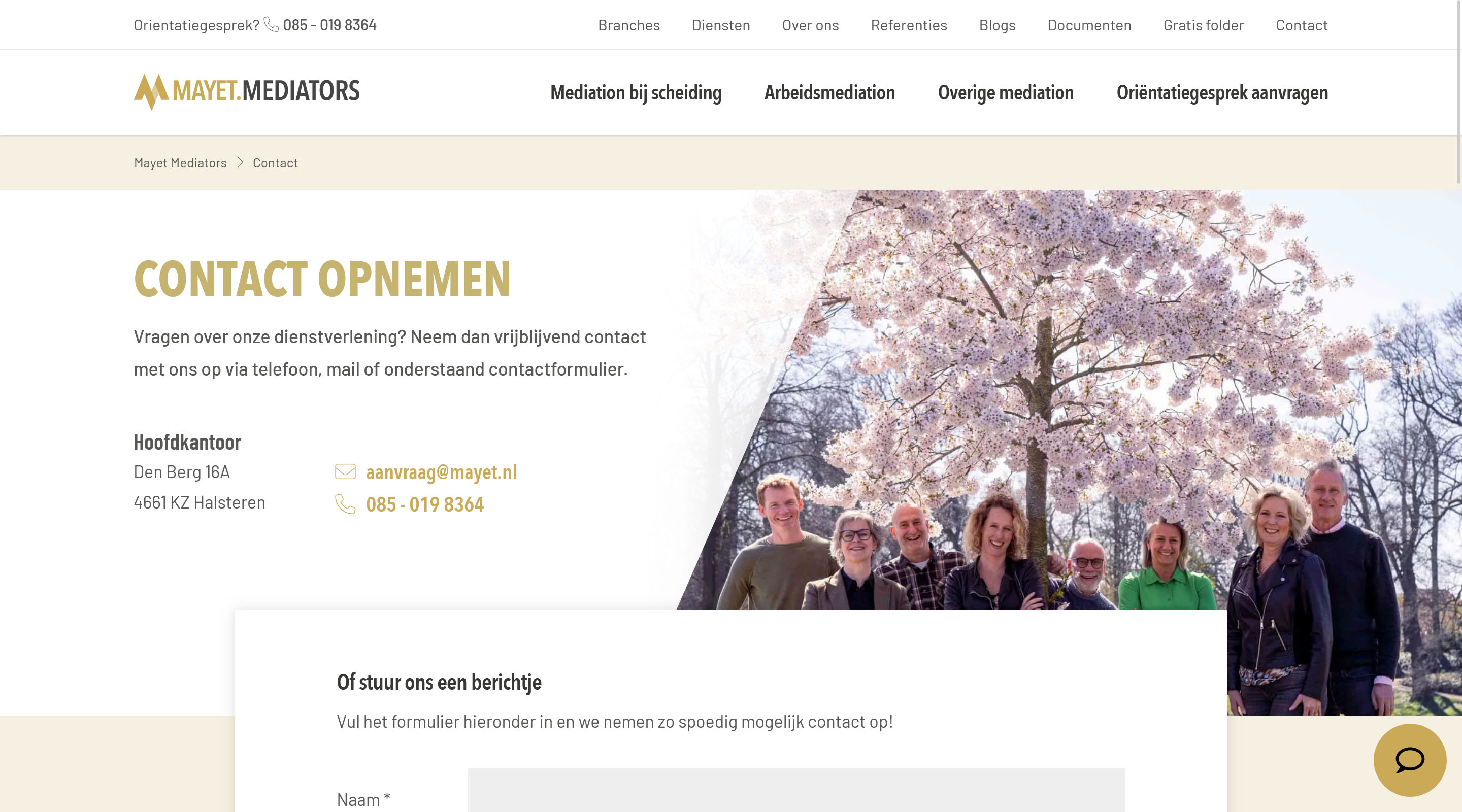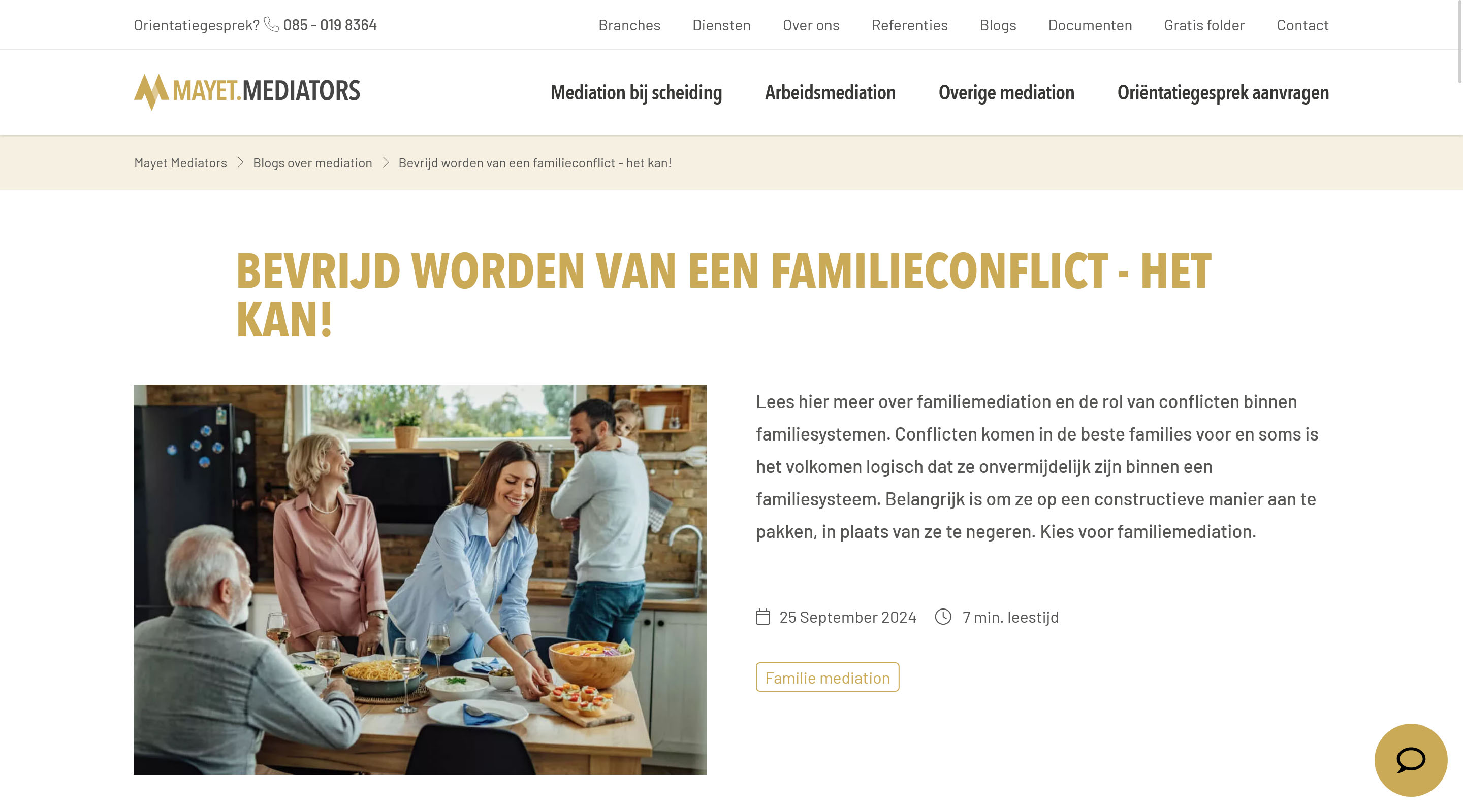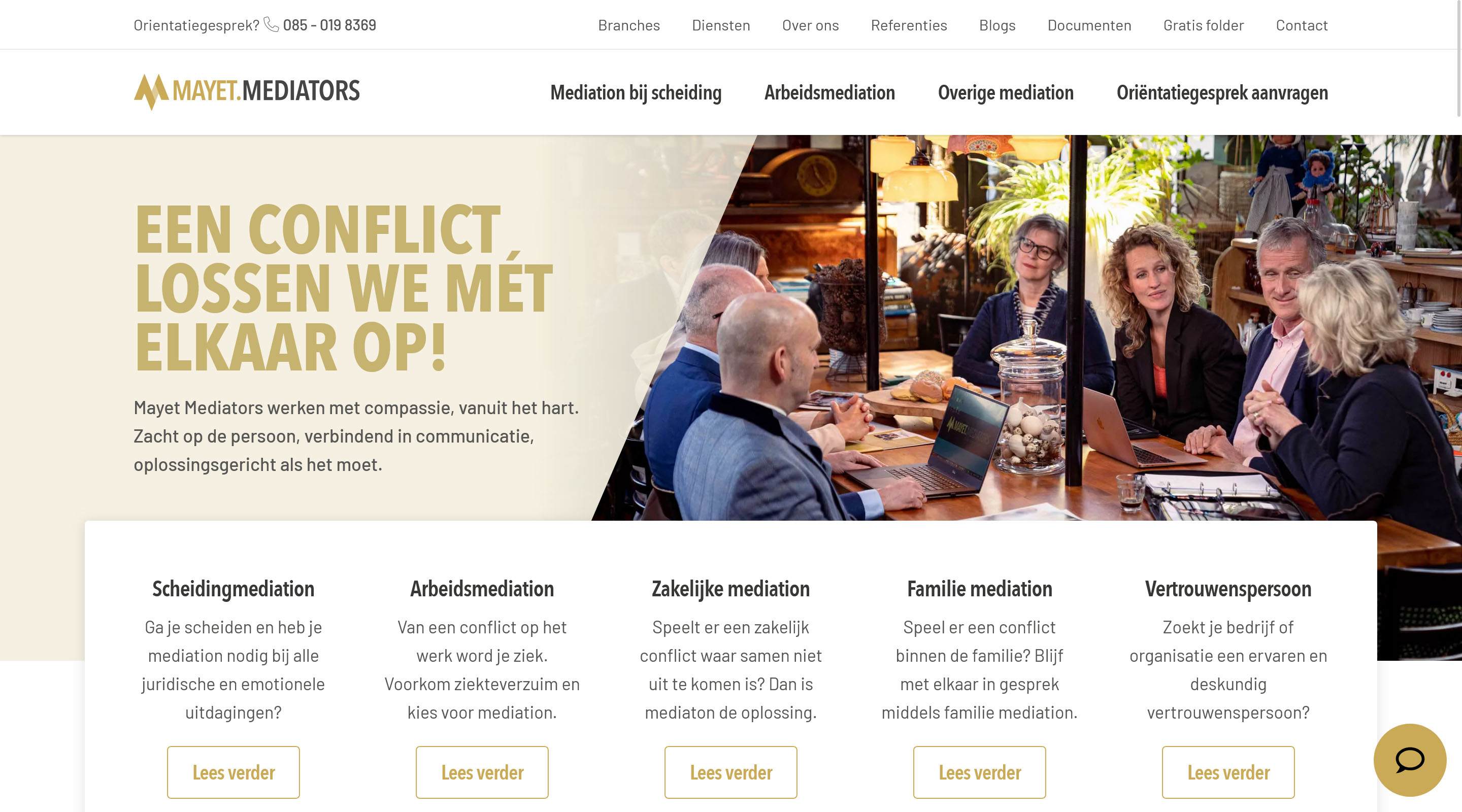 Voor Mayet Mediators heeft RB-Media een nieuwe website ontwikkeld. Deze website biedt snelle conversiemogelijkheden voor mensen die op zoek zijn naar een professionele mediators voor zakelijke geschillen en arbeidsconflicten of familie- en scheidingsbemiddeling. Het opbouwen van organische vindbaarheid was een belangrijk speerpunt binnen de website. Door een goede interne samenwerking met het online marketing team, is de URL- en menustructuur volledig SEO-proof.