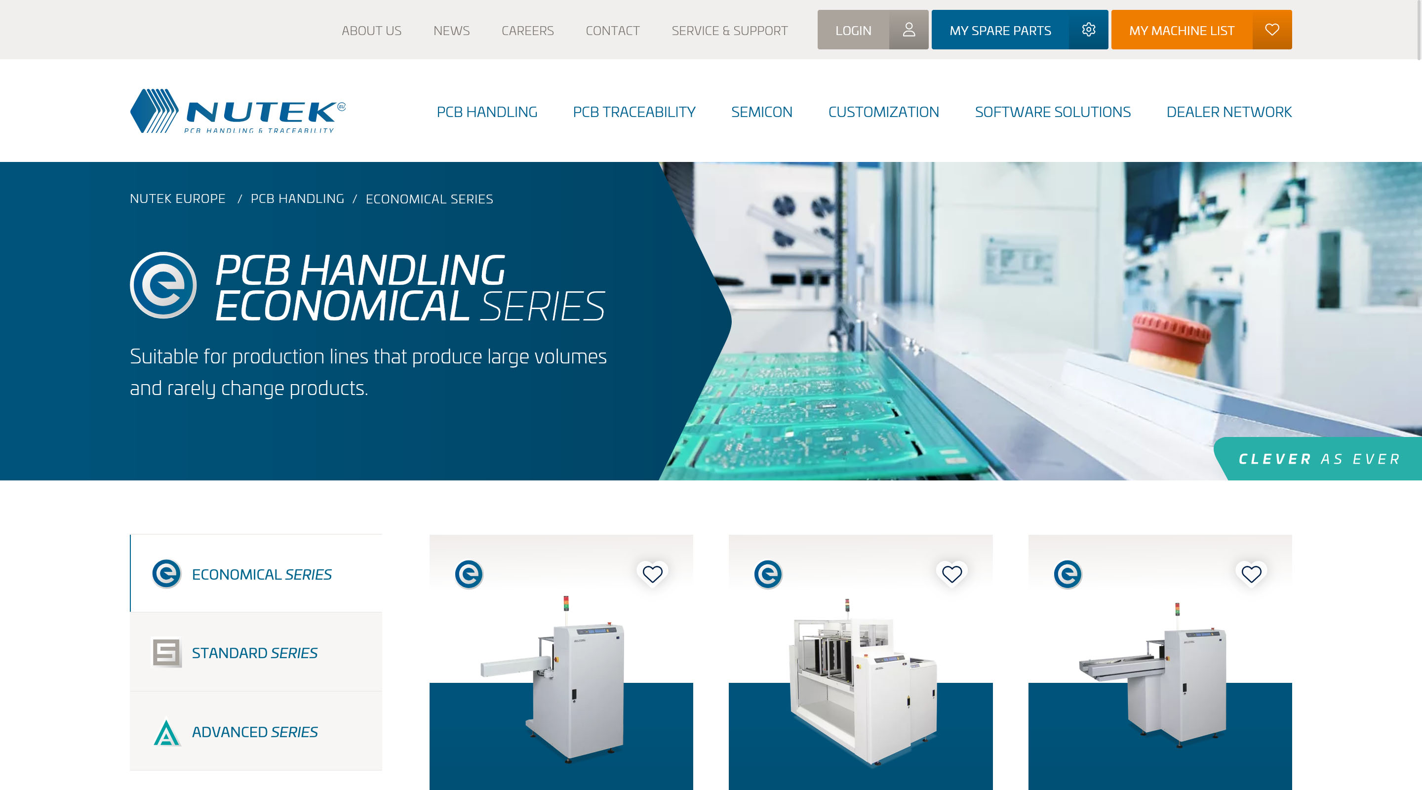De PCB Handling, Semicon en Tracibilty-producten hebben ieder hun eigen detailpagina met bijbehorende informatie, te configureren opties, datasheets en mogelijkheid tot het toevoegen aan de configuratielijst: het zogeheten 'Circuit'. Ieder product is afzonderlijk te configureren, zodat Nutek de volledige vrijheid kan bieden voor de samenstelling van de machines.